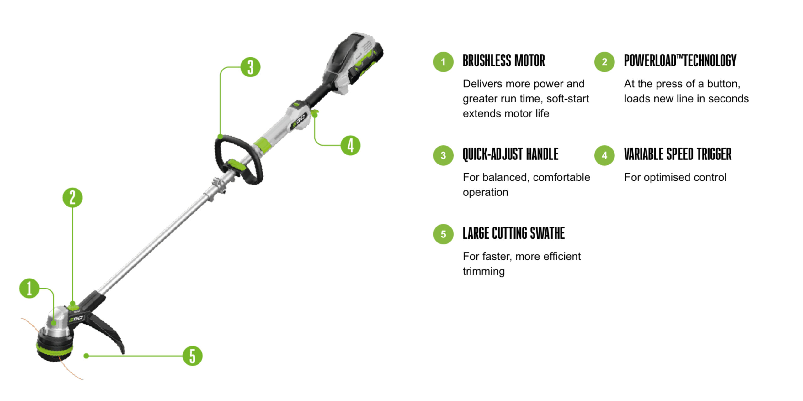 The ST1401E-ST line trimmer is equipped with our unique Powerloadâ„¢ technology. Following on from the world’s first self-winding line trimmer (EGO Power+ ST1510E), the this model provides you more choice in this game-changing technology.