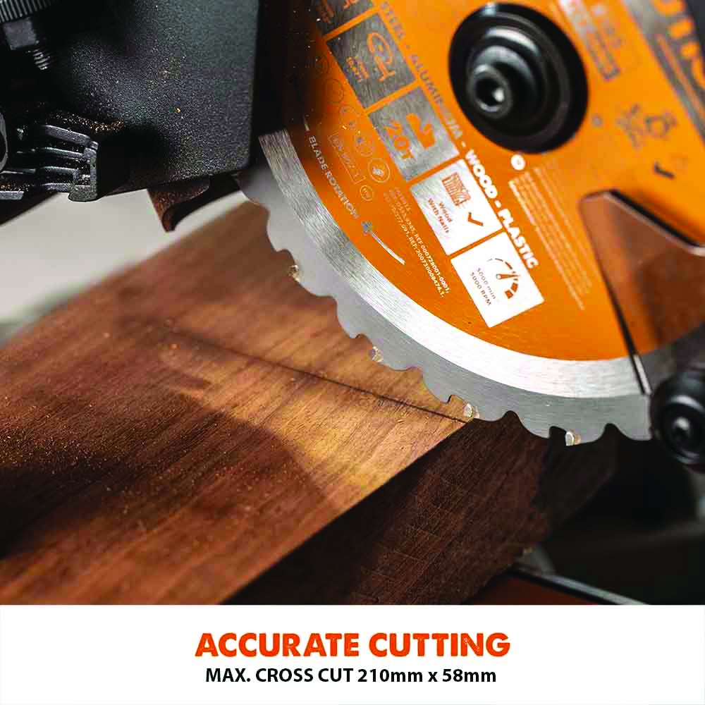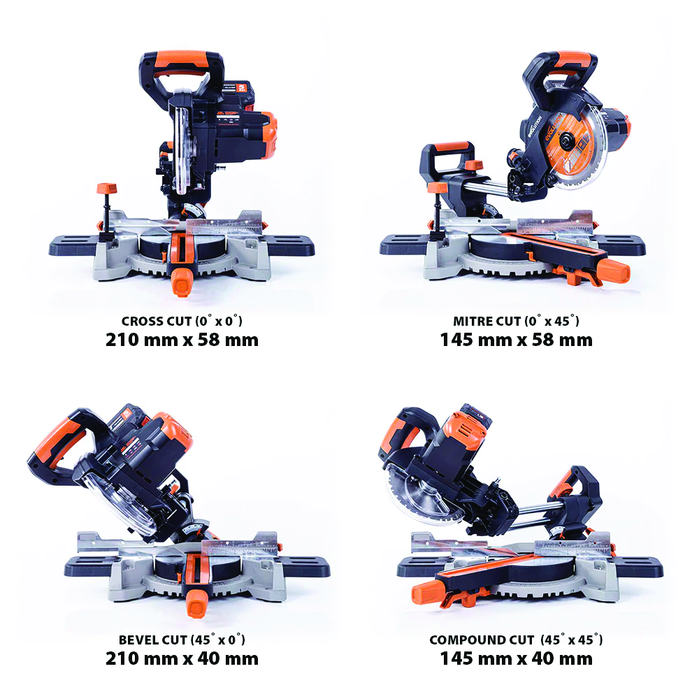 - Accurate Bevel, Mitre, and Compound Cuts: Achieve the precise cuts with detent stops at popular angles, backed by a range of 0-45° bevel and 50°- 50° mitre cutting capacity.