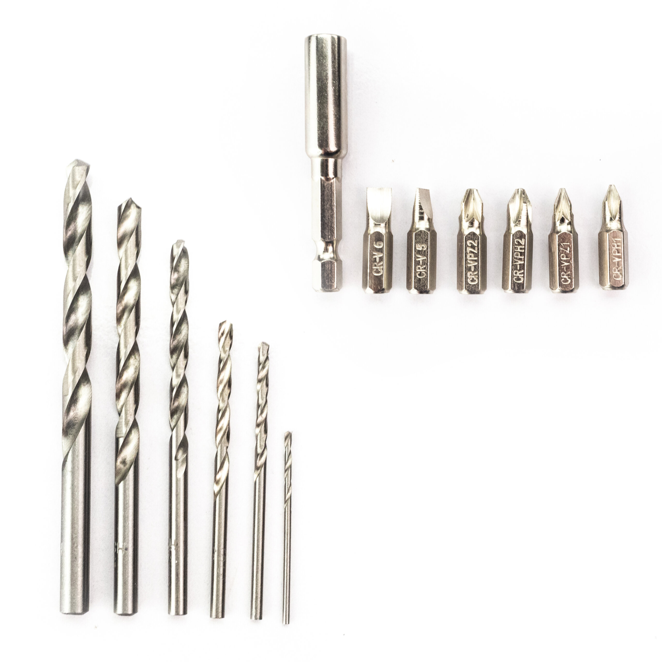 - Includes battery and charger and 13-piece drill bit accessory kit