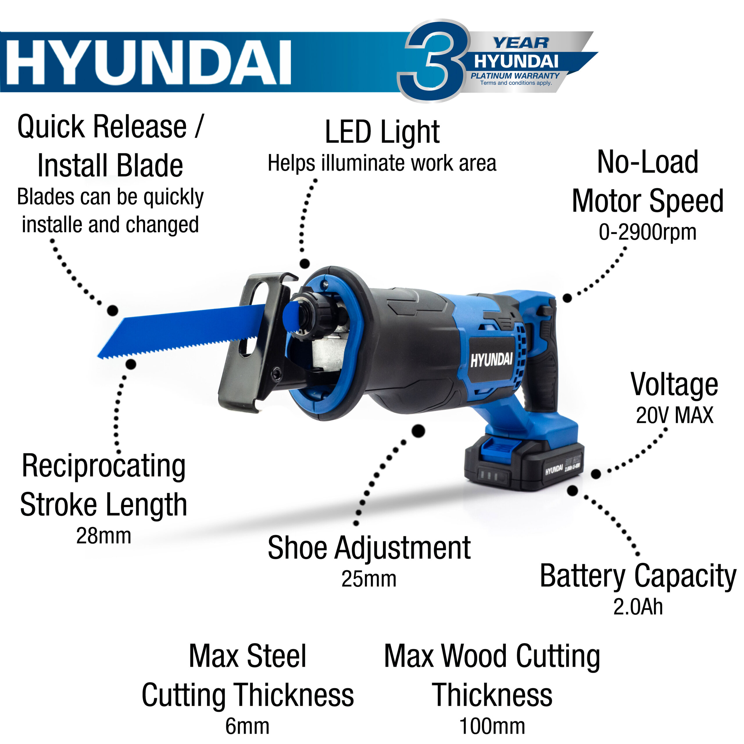 The HY2181 is a cordless reciprocating saw from Hyundai’s brand new 20v MAX range, designed for quickly making cuts and slices in wood and metal.