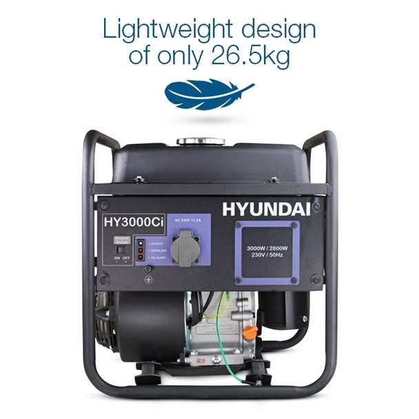 The Hyundai 3kW petrol generator design is much lighter and built to be much more compact, compared to conventional generators which are around 50% heavier and bulkier. This is a real bonus when lifting the generator in and out of storage. The HY3000Ci weighs 26.5kg compared to a conventional open frame 3kw generator weighing around 45kg.