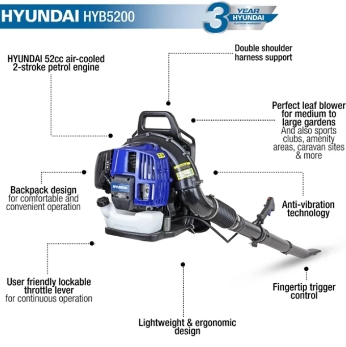 This powerful yard blower is guaranteed by our Hyundai 3-year platinum warranty, which includes complete UK parts and labor for greater peace of mind.
