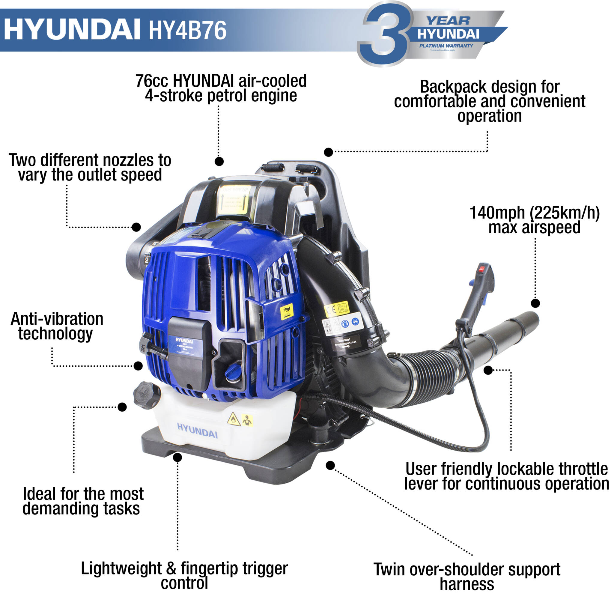 For added peace of mind. This powerful garden blower is covered by our Hyundai 3 year platinum warranty, including full UK parts and labour.