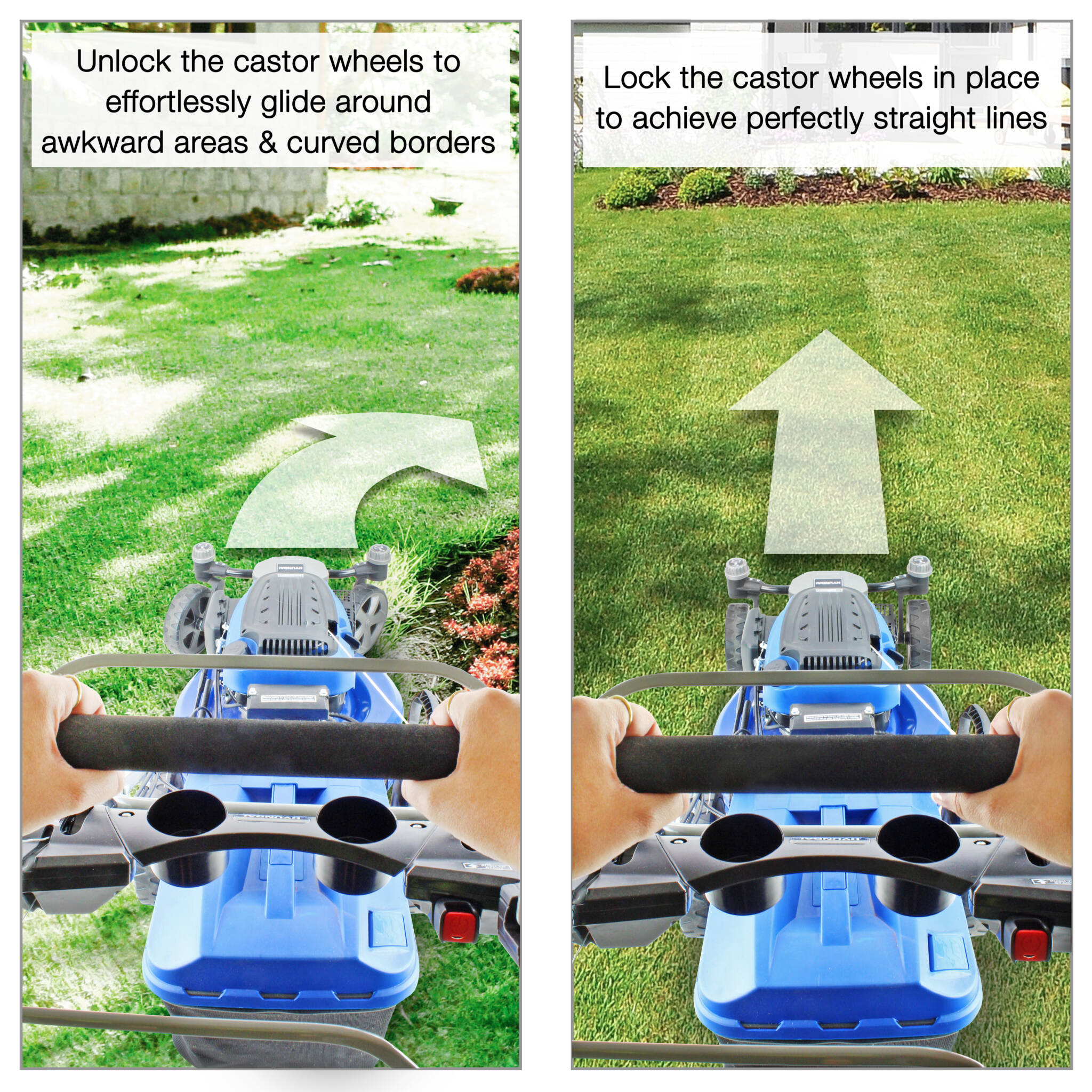 Its pivoting front axle-mounted wheels let you effortlessly glide through turns and obstacles. Moving over rough terrain for an even cut. The front castor wheels can also be locked into place allowing easy straight line cutting also.