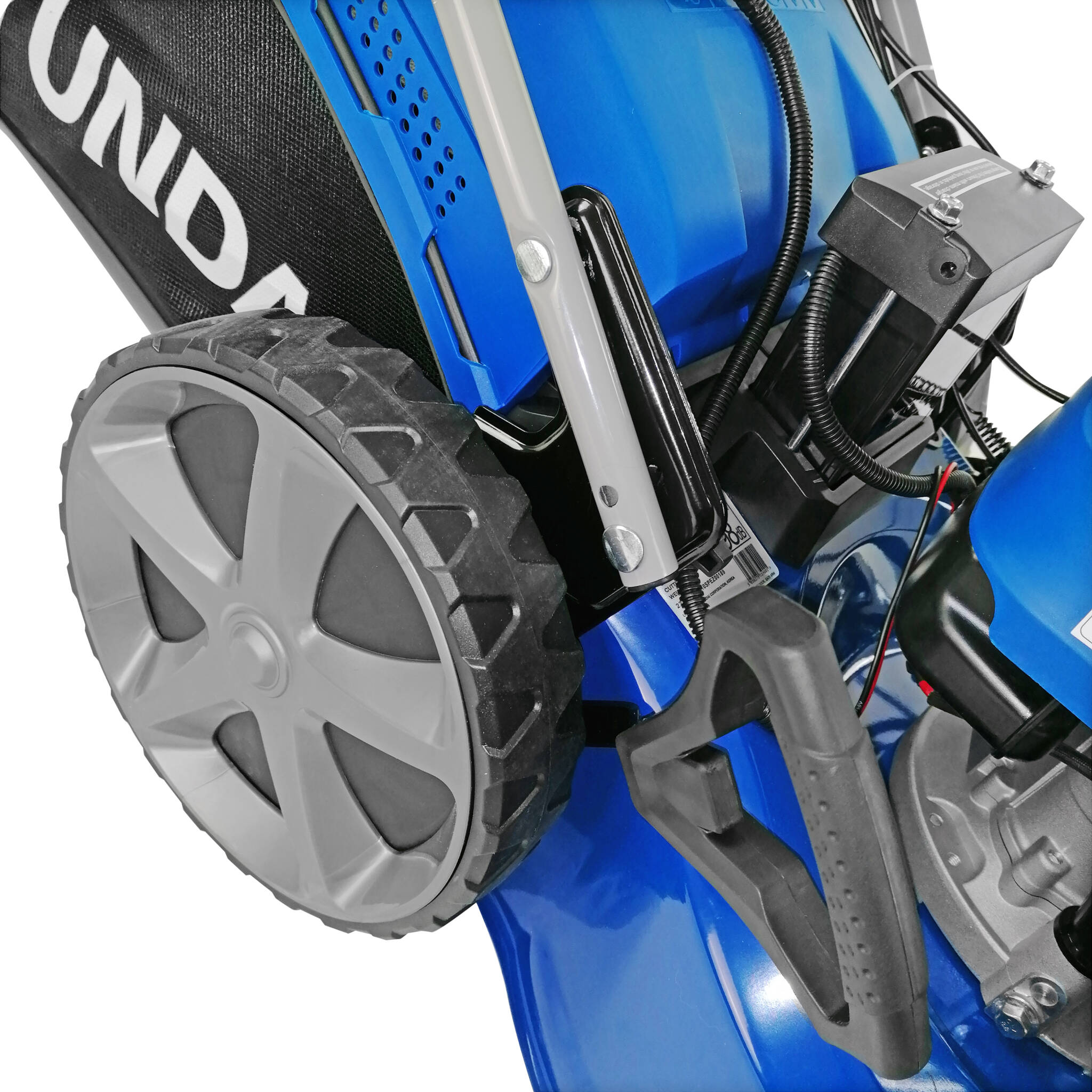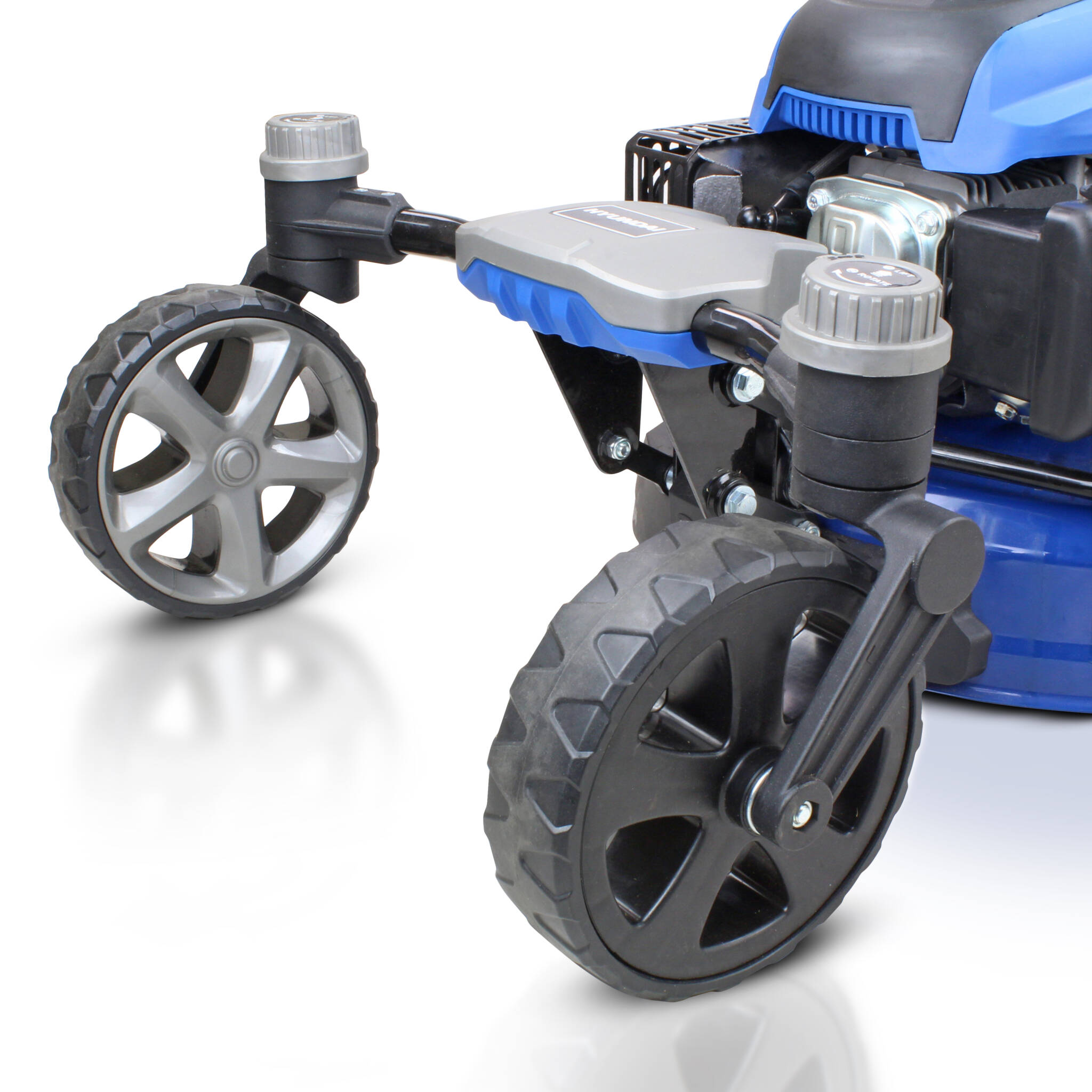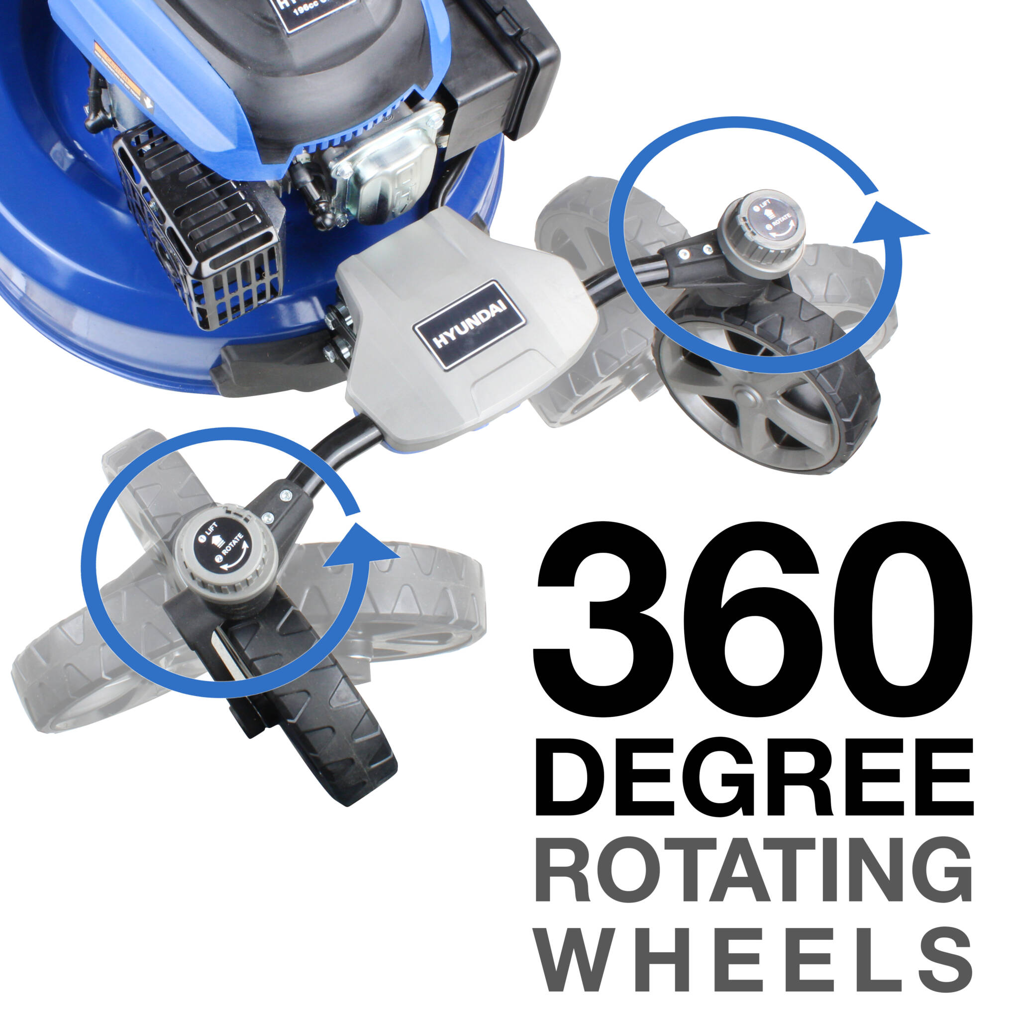 - 360 degree swivelling front wheels which allow the mower to be turned on its own footprint