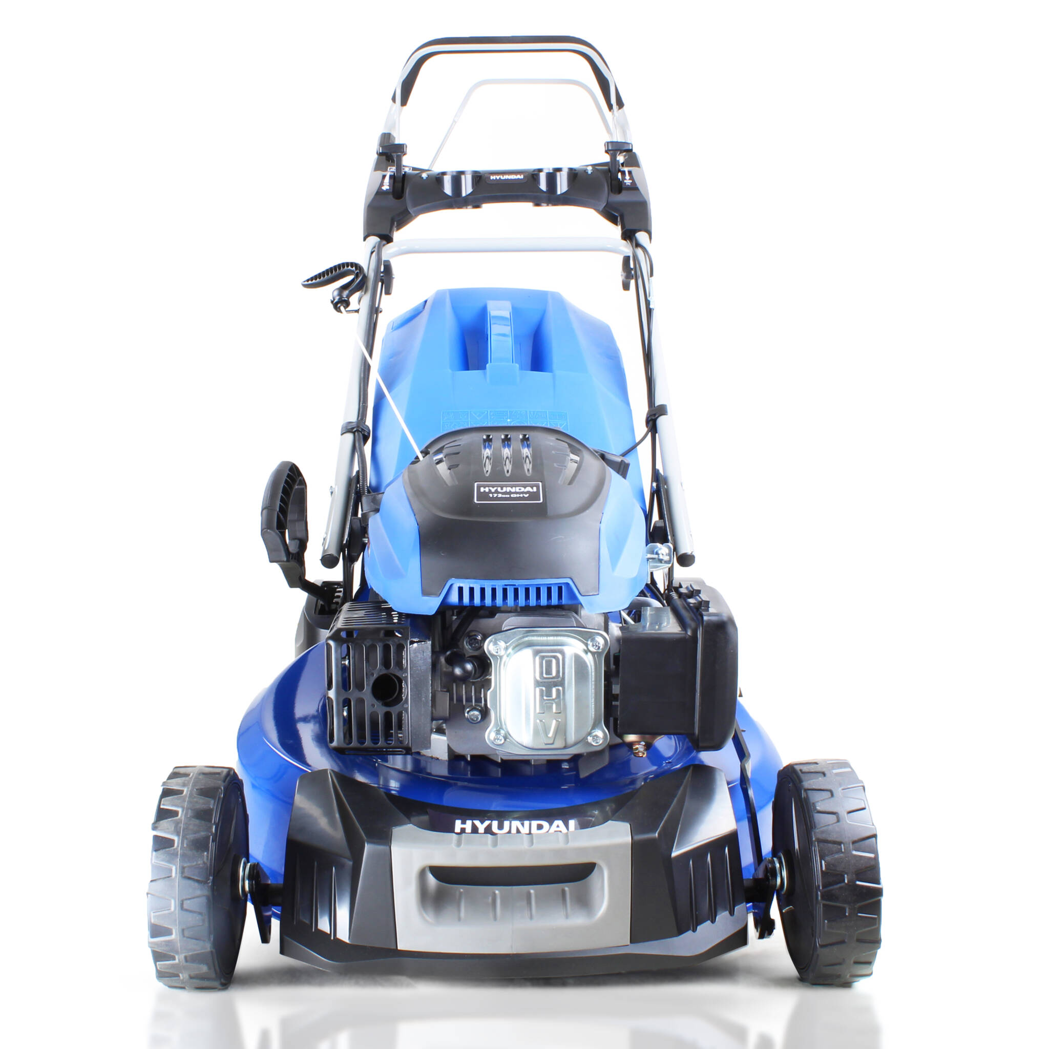 The HYM530SPER is a petrol self-propelled lawn mower from Hyundai with electric push-button start and rear roller, specifically designed for mowing stripes into your lawn.