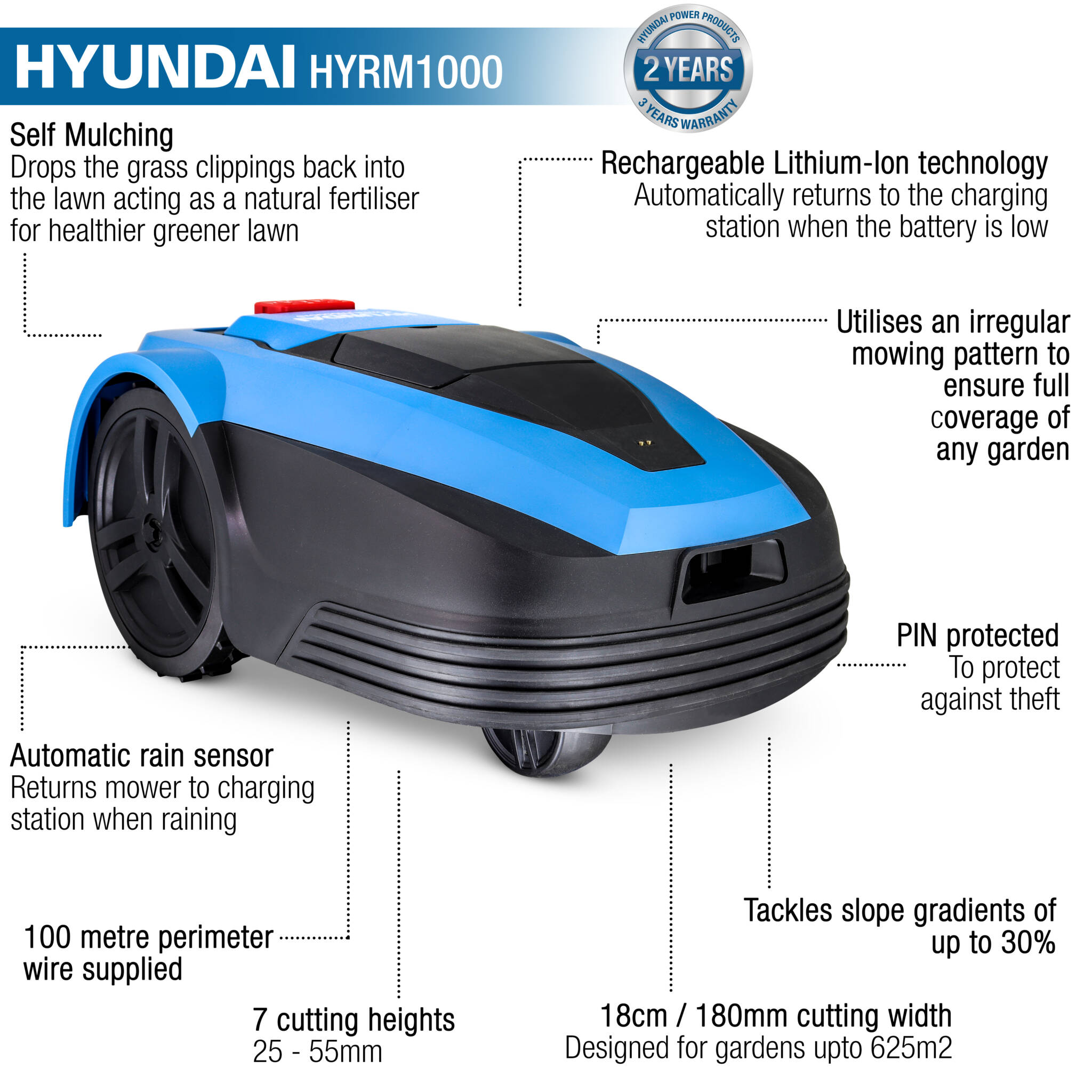 For added peace of mind, this rechargeable robo mower comes with a 2 year Hyundai warranty.