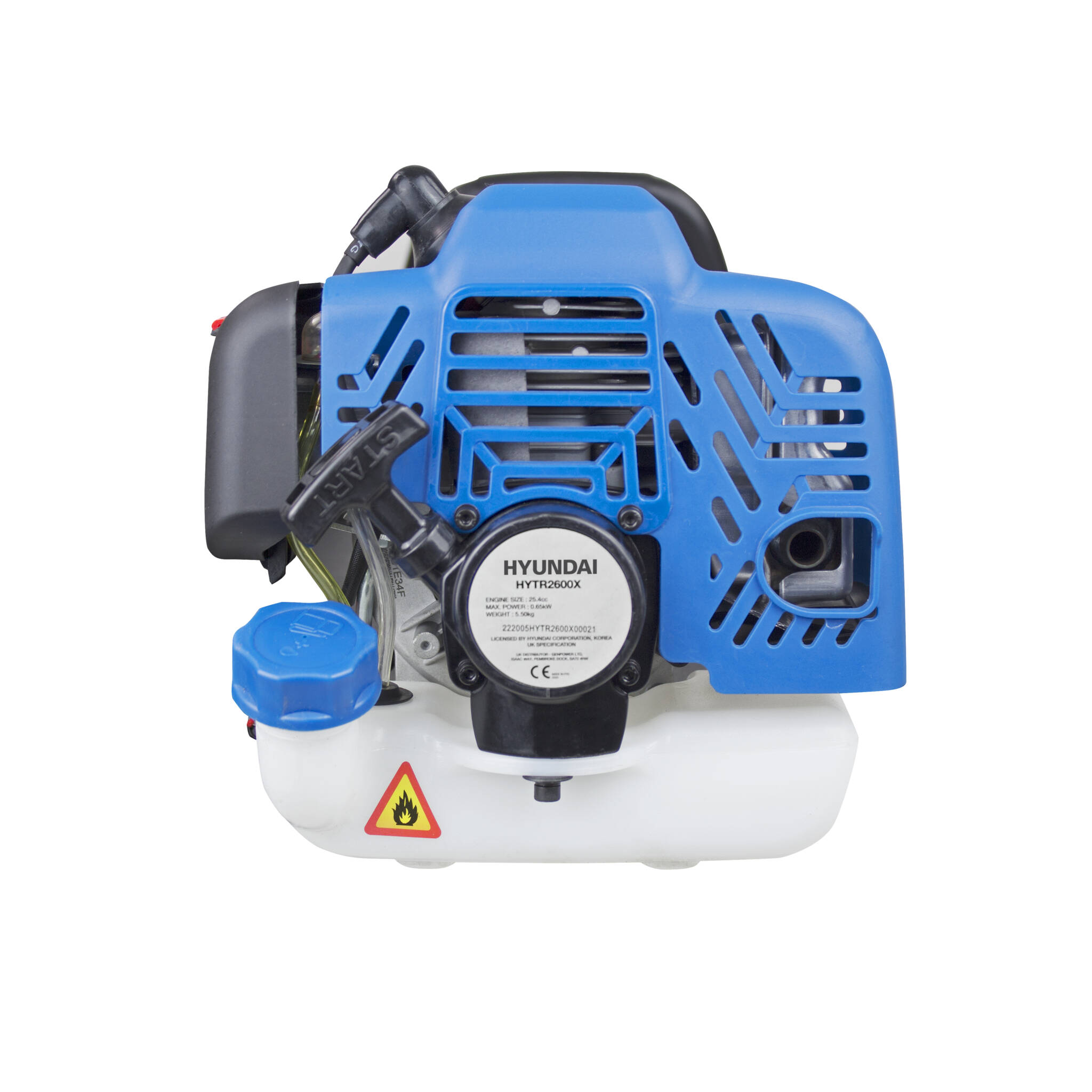 The Hyundai HYTR2600X is a lightweight petrol grass trimmer designed to be used without a harness, ideal for easily maintaining your garden.