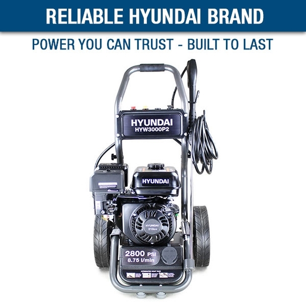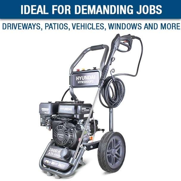 The Hyundai Petrol Pressure Washer 2800psi 210cc is a very popular power washer, the Hyundai HYW3000P2 is powered by the reliable Hyundai 210cc 4-stroke high torque, Euro V low-emission recoil start petrol engine, which is engineered to handle your toughest cleaning jobs with ease.