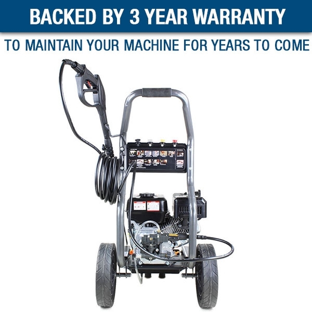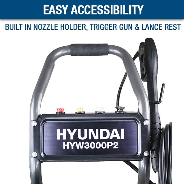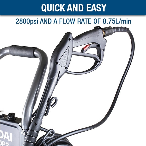 The HYW3000P2 delivers 2800psi pressure and a flow rate of 8.75l/min from the triple stainless steel piston high pressure pump for quick, easy and effective cleaning of driveways, patios, vehicles, windows and any other demanding tasks where a high pressure washer is needed.