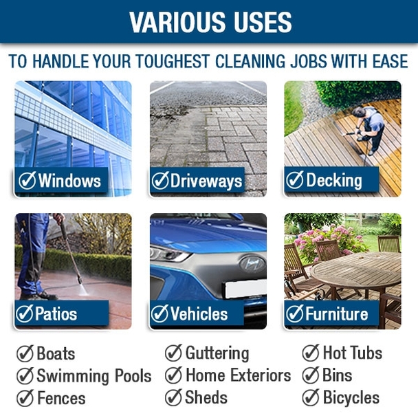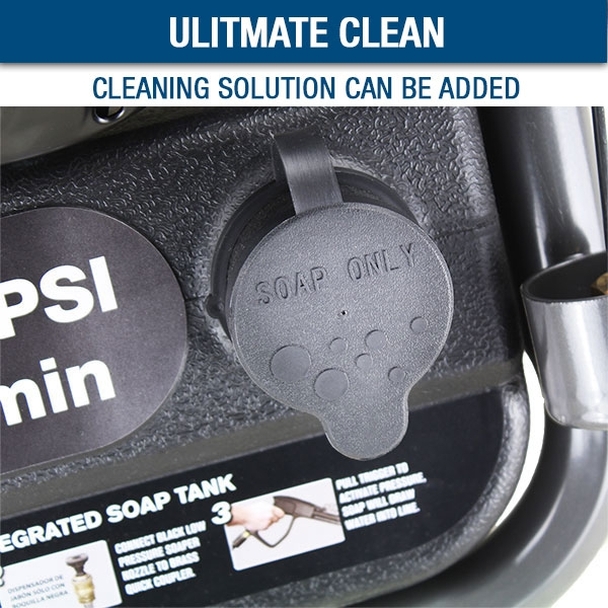 The built in 3 litre soap tank allows a cleaning solution or traffic film remover to be added for an ultimate deep clean power wash when required. Always follow manufacturer directions and dilute the mixture to the required strength.
