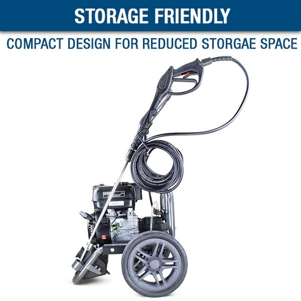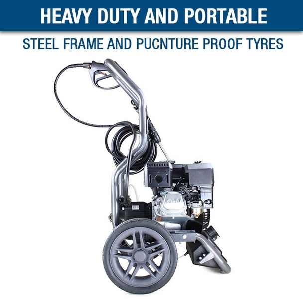 The user-friendly easy pull start engine makes jobs where no electricity is available incredibly convenient, and it’s also fitted with tough puncture proof tyres which makes this a truly portable pressure washer.