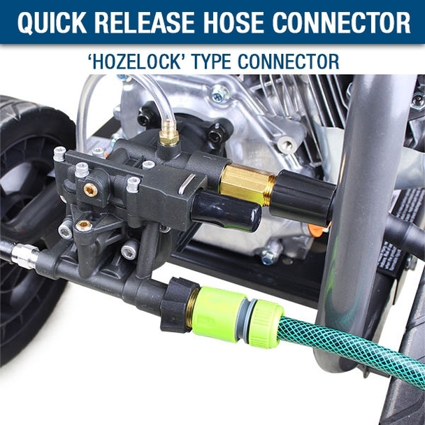 This petrol power pressure washer can be connected to the mains water supply via a garden hose with quick release ‘Hozelock’ type connector or can be gravity fed from a water tank.