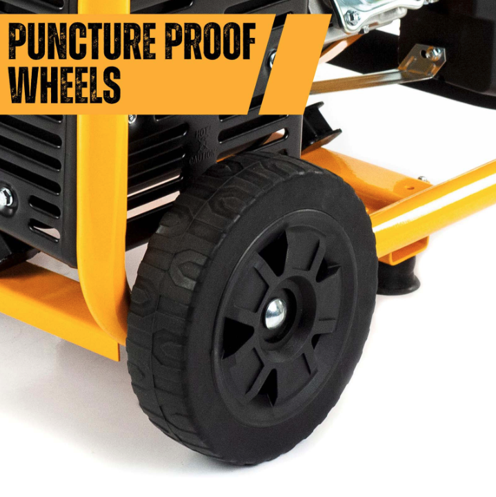 - Durable Construction: Mounted on puncture-proof tires and encased in a robust 32mm tubular steel frame, the generator is built to withstand harsh conditions and environments.