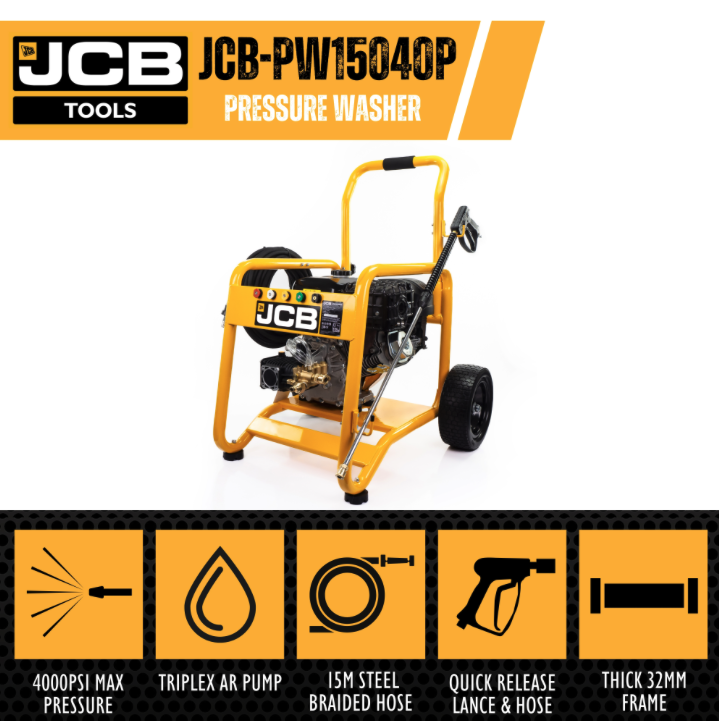 The JCB-PW15040P Petrol Pressure Washer is an advanced and powerful cleaning solution that meets the needs of both professional and domestic users. This high-performance tool is powered by a JCB 457cc 4-stroke, 15HP high-torque Euro V low-emissions petrol engine, ensuring robust performance and environmental compliance. Its remarkable 4000 psi / 276 bar pressure capacity and 15L/min flow rate guarantee thorough and efficient cleaning, making it ideal for handling the toughest cleaning tasks with ease.
