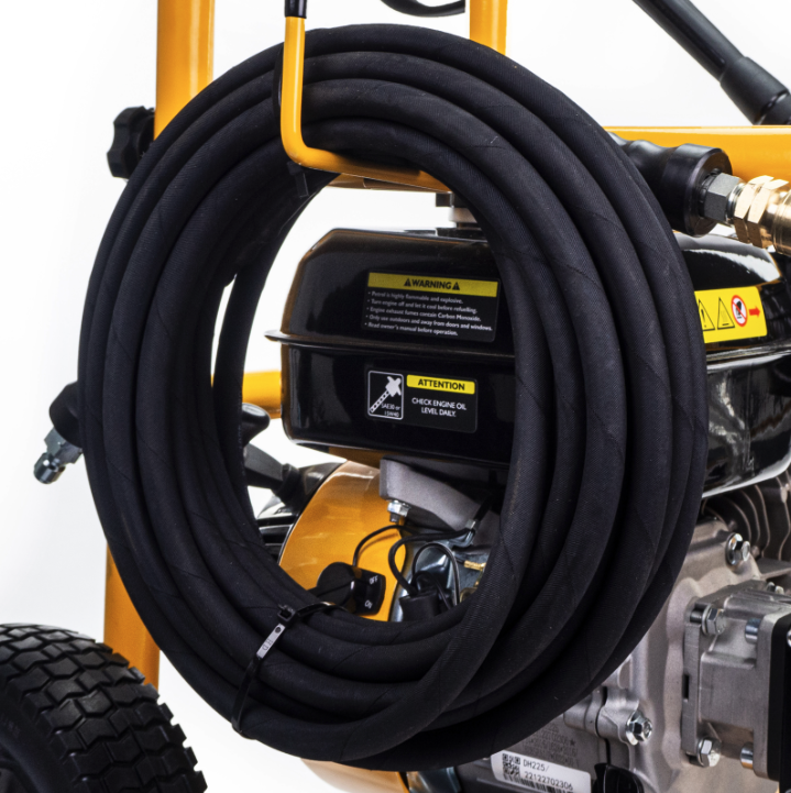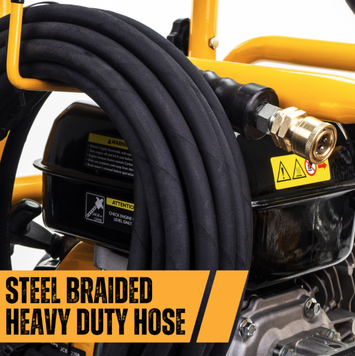 This model stands out with its durable and efficient pump, produced by Annovi Reverberi (AR), a leader in the industry. The triplex pump with ceramic pistons and a brass head is built for longevity and reliability, incorporating unloader and thermal relief valves. Moreover, the JCB-PW15040P’s extended 15.24m hose offers an extensive reach, ideal for cleaning large areas like driveways, estates, and agricultural machinery without the need for frequent repositioning. The design of this pressure washer thus enables efficient cleaning over large spaces.