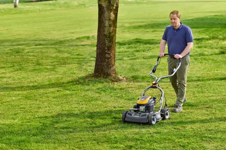 The self-propelled STIGA Multiclip 950 VE lawn mower has a 48 cm blade and is powered by a 196 cc STIGA engine with a net power output of 3.2kW @ 2900 rpm and features an electric start. The mulching system delivers a precise cut and finely shreds the cuttings before spreading them on the ground as a fertilizer.