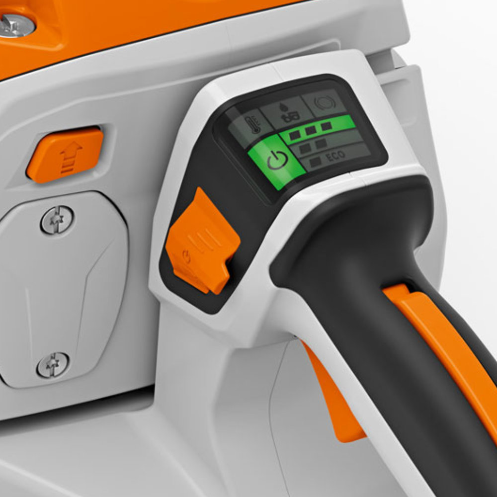 - LED display with clear red and green LEDs that highlight the power level, on/off status, chain brake status, and temperature warnings
