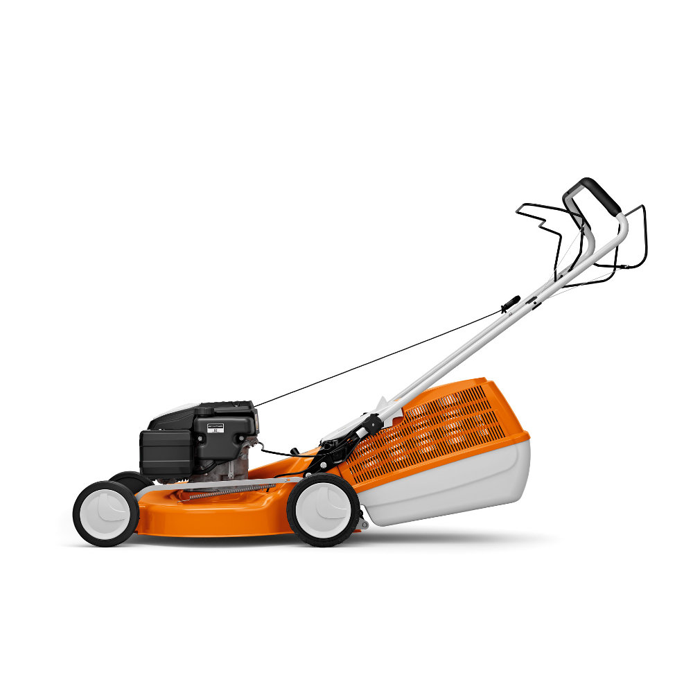 The highlift blade of the RM 253 T provides a precise finish to the lawn, ensuring optimal filling of the grass catcher box. The smooth running wheels are robust and hard-wearing, equipped with a traction pattern and directional stability tread pattern for effortless manoeuvring and to help hold perfect line during mowing. The super soft grip is comfortable to hold even when used over longer periods, and the foldable handlebars make the lawn mower more compact for space-saving storage or transport. The torsion-resistant sheet steel deck ensures durability and longevity, while the central cutting height adjustment is spring-loaded, making it easy to set the desired cutting height.