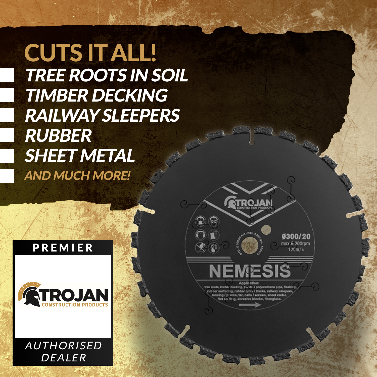The Trojan Platinum Nemesis 300mm Blade uses tungsten carbide clusters to cut all materials that a diamond blade can’t cut.